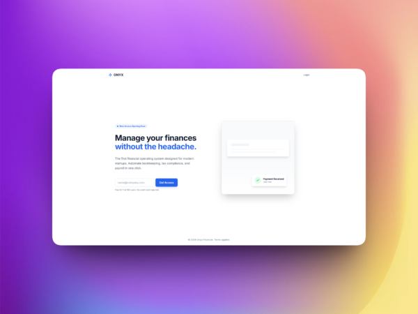 ☁️ ONYX LIGHT (Corporate): A clean, trustworthy aesthetic inspired by industry leaders like Stripe and Linear. Ideal for Fintech, B2B, and medical startups.