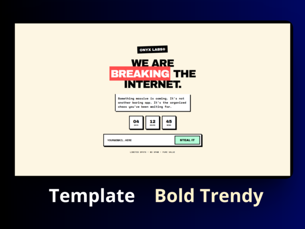 ⚡ ONYX BOLD (Trendy): A high-contrast, Neo-Brutalist design. Aggressive and viral. Perfect for Gen-Z apps, fashion brands, and dropshipping.